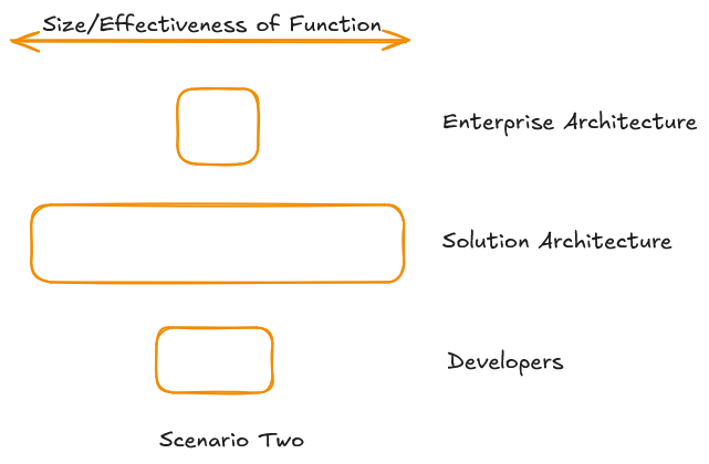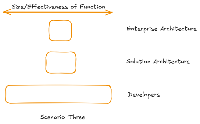 Scenario One: Dominant Enterprise Architecture, Weak Solution Architecture and Engineering function – lots of strategy, chasing and waiting for the next big thing. Also leads to so-called cargo culting.
